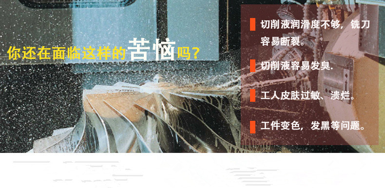 【产品用途】是一种用在金属切削、磨加工过程中,用来冷却和润滑刀具和加工件的工业用液体,切削液由多种超强功能助剂经科学复合配合而成,同时具备良好的冷却性能、润滑性能、防锈性能、除油清洗功能、防腐功能、易稀释特点。克服了传统皂基乳化液夏天易臭、冬天难稀释、防锈效果差的的毛病,对车床漆也无不良影响,适用于黑色金属的切削及磨加工,属当前最领先的磨削产品