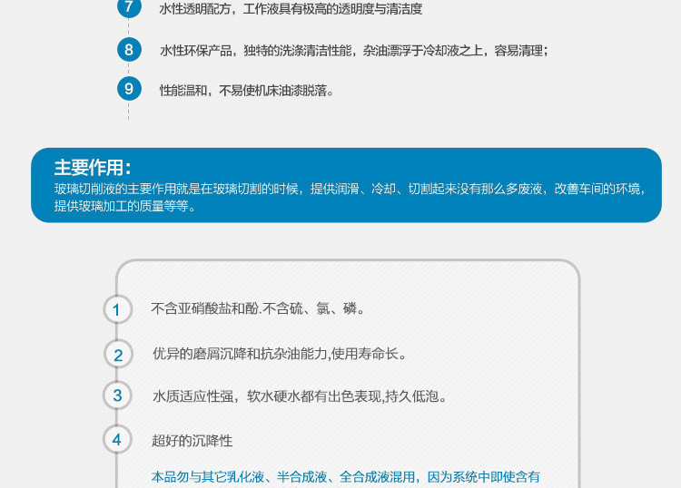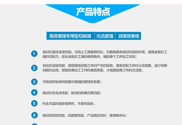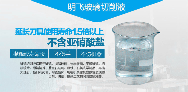该产品是新型高浓度,低稀释的经济高效型水溶性磨削液,广泛用于各种烧结和树脂等结合剂的金刚石工具,磨削加工光学零件,可显著提高研磨能力,缩短研磨时间(近20%至30%),不容易在零件上留下磨痕,大大提高零件的表面质量,同时不损害皮肤,对机床设备无锈蚀,对环境无污染,水性环保产品,独特的洗涤清洁性能,沉降性好,容易清理是理想的环保型的冷却液