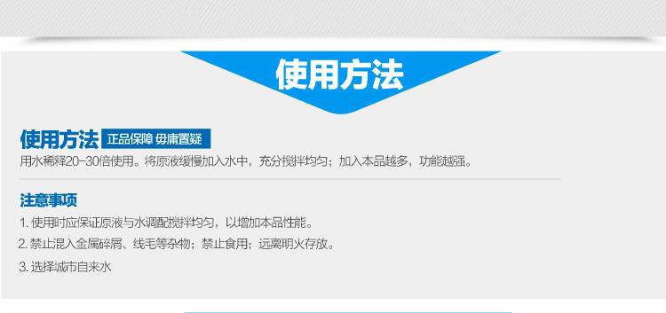 使用方法:在使用本产品时,应按1:20(原液:水重量比),混合均匀后即可使用,在加工过程中若有损耗,应按比例补充原液和水。否则会影响使用效果。