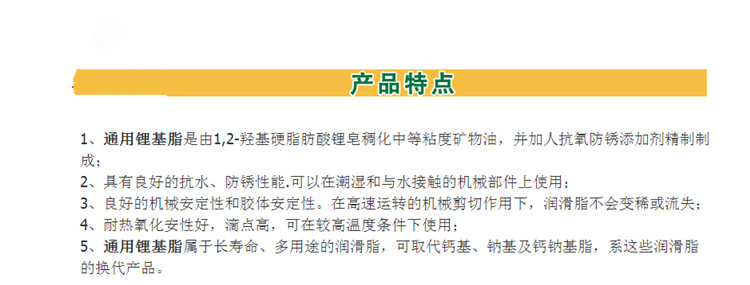 性能与适用范围:本品采用羟基脂肪酸锂皂稠化精制矿物油,加入抗氧、防锈等多种添加剂精制而成。具有优良的机械安定性、氧化安定性和良好的抗水、防锈性能。