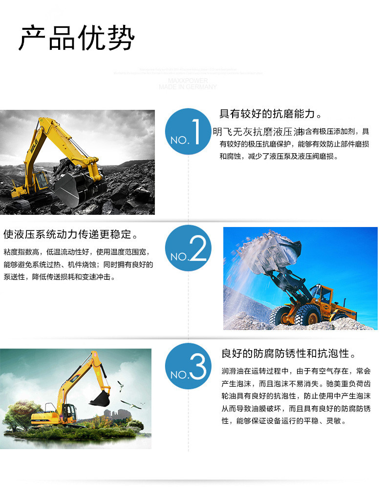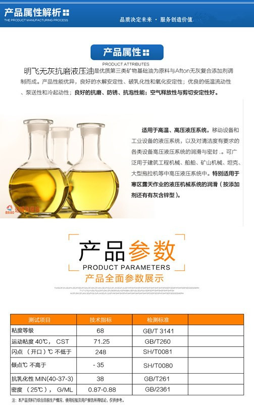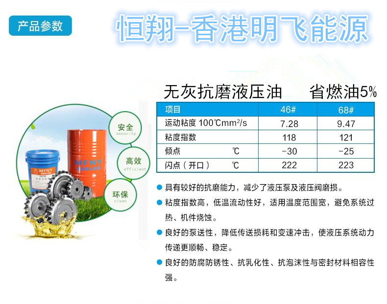 【产品特点】具有良好的防锈性及抗氧化安定性,在高温高压条件下不易氧化变质,使用寿命长。延长液压机器的使用寿命——节省维护费用,优秀的抗磨损性能。