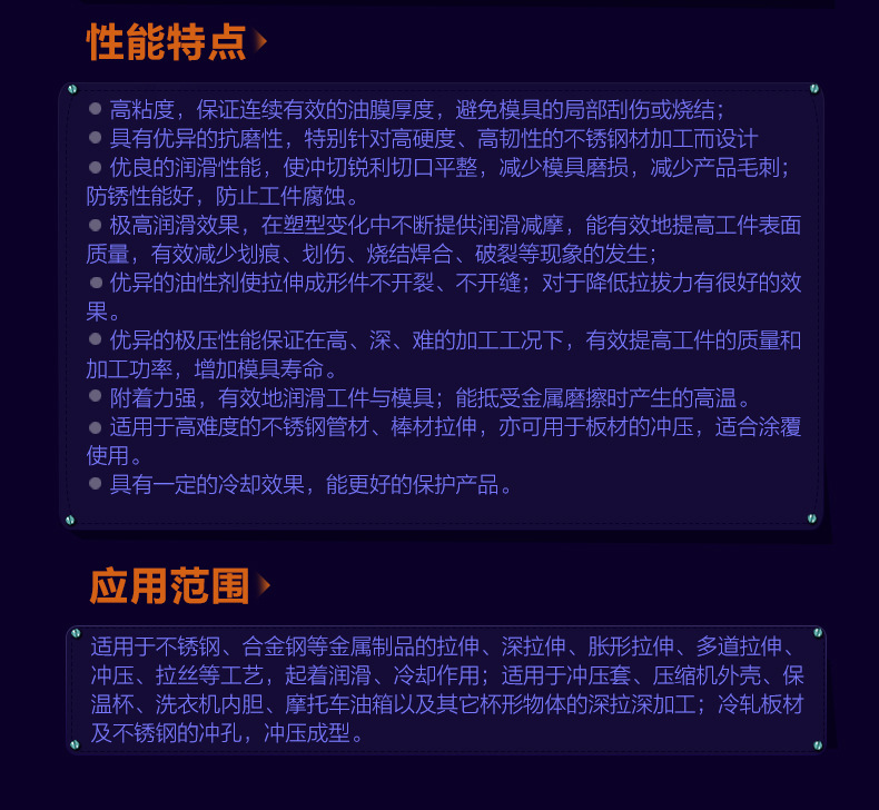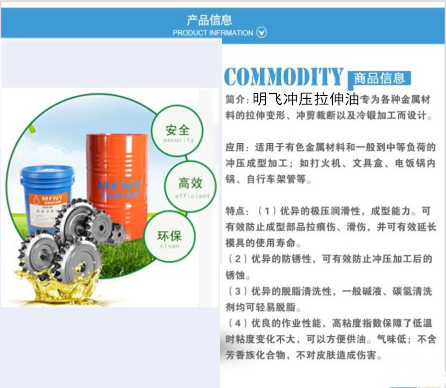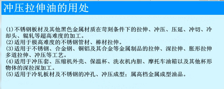 【产品特点】金属拉伸、冲压、冲剪成型而生产的高效能金属成型油,内含多种特殊添加剂。组分中油性、抗磨和极压添加剂的良好配合,使产品具有良好的负荷能力和防烧结功能,有效防止模具及工件“拖花”、“拉爆”,提高产品的质量及模具寿命。