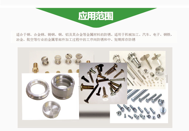 - 适用于各种金属材质的中长期防锈,特别适用于马口铁五金件的防锈。